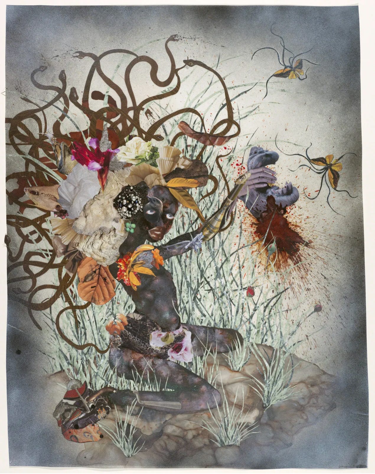 We’ve paired this piece with Wangechi Mutu’s The Bride Who Married a Camel’s Head (2009)1 Mutu builds hybrid women from magazine cutouts, medical illustrations, and ink—figures torn apart and reassembled into something fiercer. This bride kneels in tall grass, flowers erupting from her head like a crown or a wound, one hand raised as if casting or catching something. She’s ornamented and monstrous, trapped in a title that sounds like a folktale warning and a curse. And then we look at her face and realize, viscerally, that she’s not afraid. Neple’s story takes off from that look.
